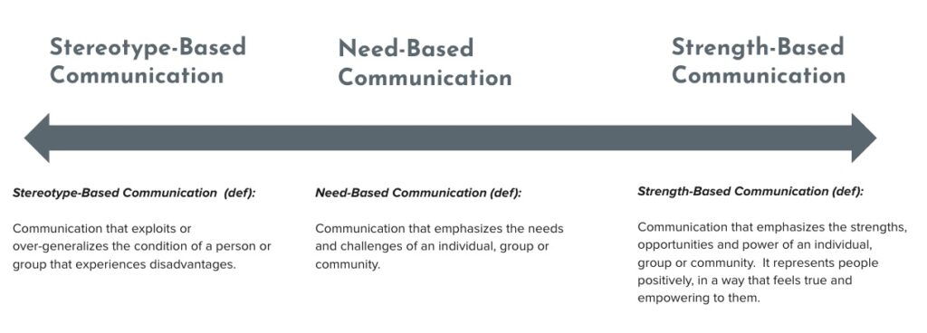 Strength-based communication captures the strengths, assets,and agency of the people and communities an organization serves. We think about communication on a spectrum: